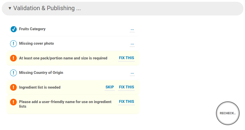 - The ‘Validation and Publishing’ section will advise on the remaining mandatory fields e.g. product code, ingredient list: