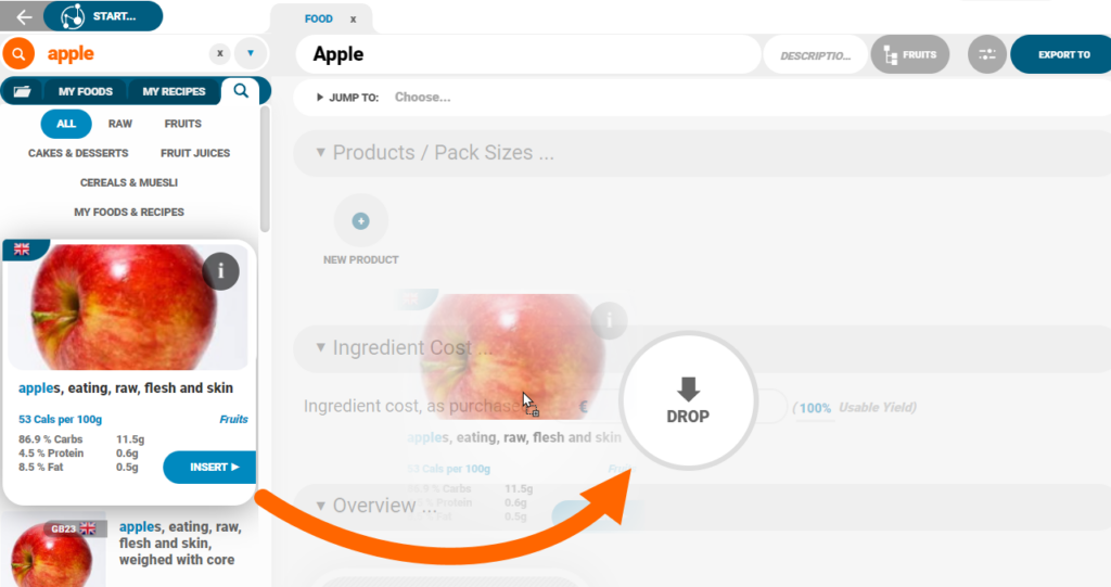 - Once selected, click ‘Insert’ or drag the food across to the workspace: