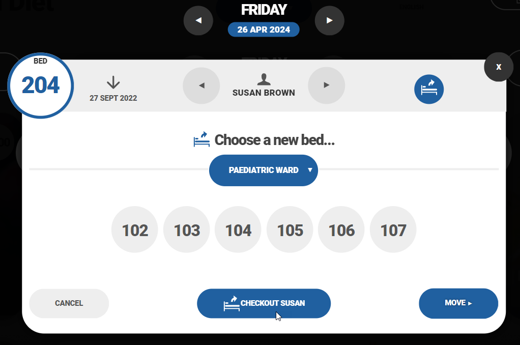 Choose a new bed or remove the patient from the bed by choosing ‘Checkout Patient’: