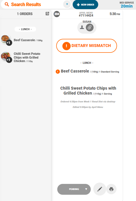Please note that if allergens, dietary properties or tags are edited after an order has been placed for a patient there may be a ‘Dietary Mismatch’. A warning will appear if the order contains items that do not comply with the new specified allergies or dietary preferences. An exclamation mark will clearly identify the specific items that pose a concern: