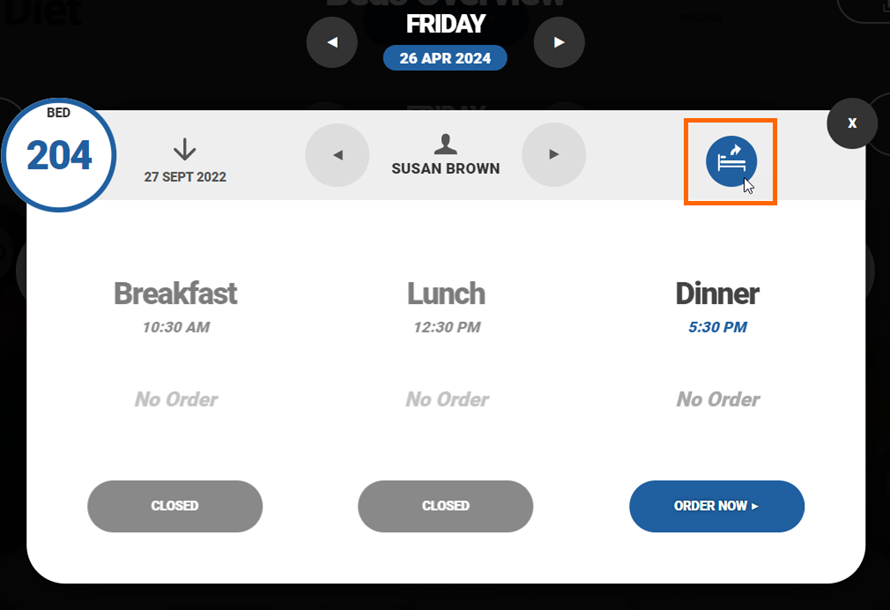 In QuickDish, you can change the patient’s bed when ordering a meal. Open the patient and click the bed icon in the top right: