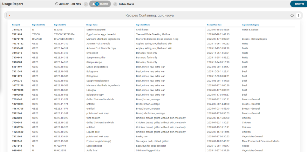 Insights Usage Reports allows you to quickly identify every recipe that contains a specific ingredient, allergen, or group of similar foods. To generate a usage report: