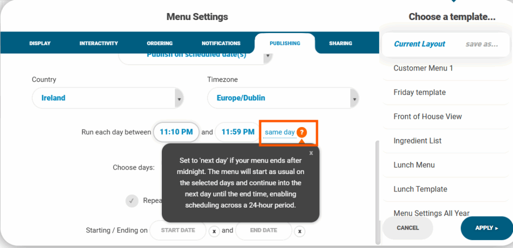 - You can enable the menu to run on the Same Day or Next Day. Enabling Next Day allows your menus to run after midnight. The menu will start as usual on the days selected and continue into the next day until it is set to end: