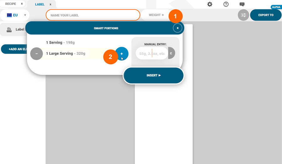 In the label maker, click on the ‘Weight’ field (1) and select the relevant portion size (2):