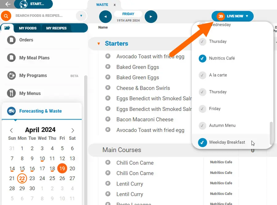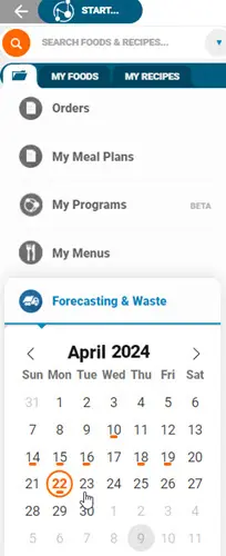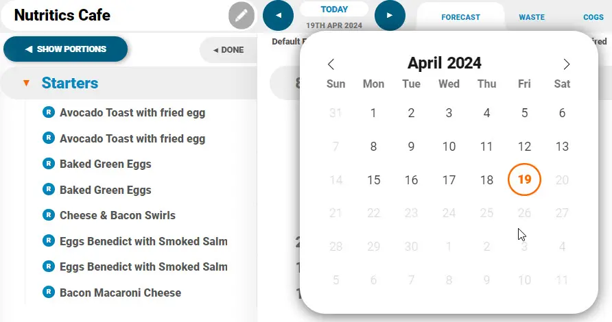 Click ‘Forecasting & Waste’ from the Nutritics Content Explorer and click a date to start tracking: