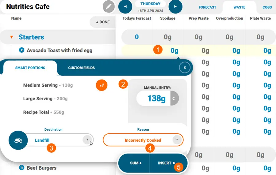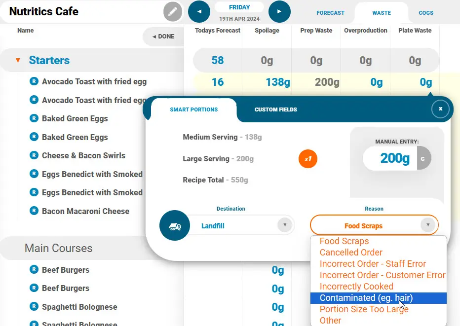 3. You can now begin tracking and analysing waste for this menu on the date selected