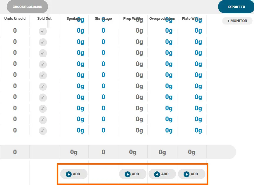 6. Scroll to the waste columns and click ‘+Add’ under the relevant column: