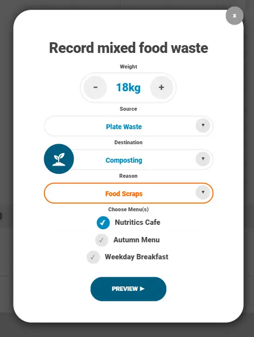 8. Click ‘Preview’ to see the changes on the dashboard and edit percentages of the waste per item on the menu(s)